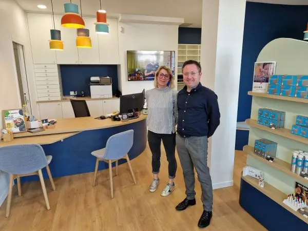 Stéphane Gratien, audioprothésiste et co-gérant de La Solution Auditive avec son assistante Julie Garotin dans le centre de La Rochelle. Photo : C.C-S.
