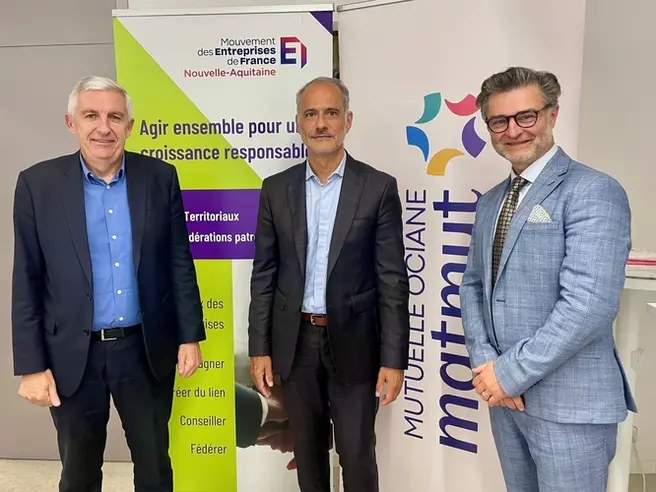 Stéphane Hasselot, DG de la mutuelle Ociane Matmut, François Perrin, président du Medef Nouvelle-Aquitaine, et Emmanuel Benjamin, directeur régional délégué de l'Ademe Nouvelle-Aquitaine. Crédit : MBC